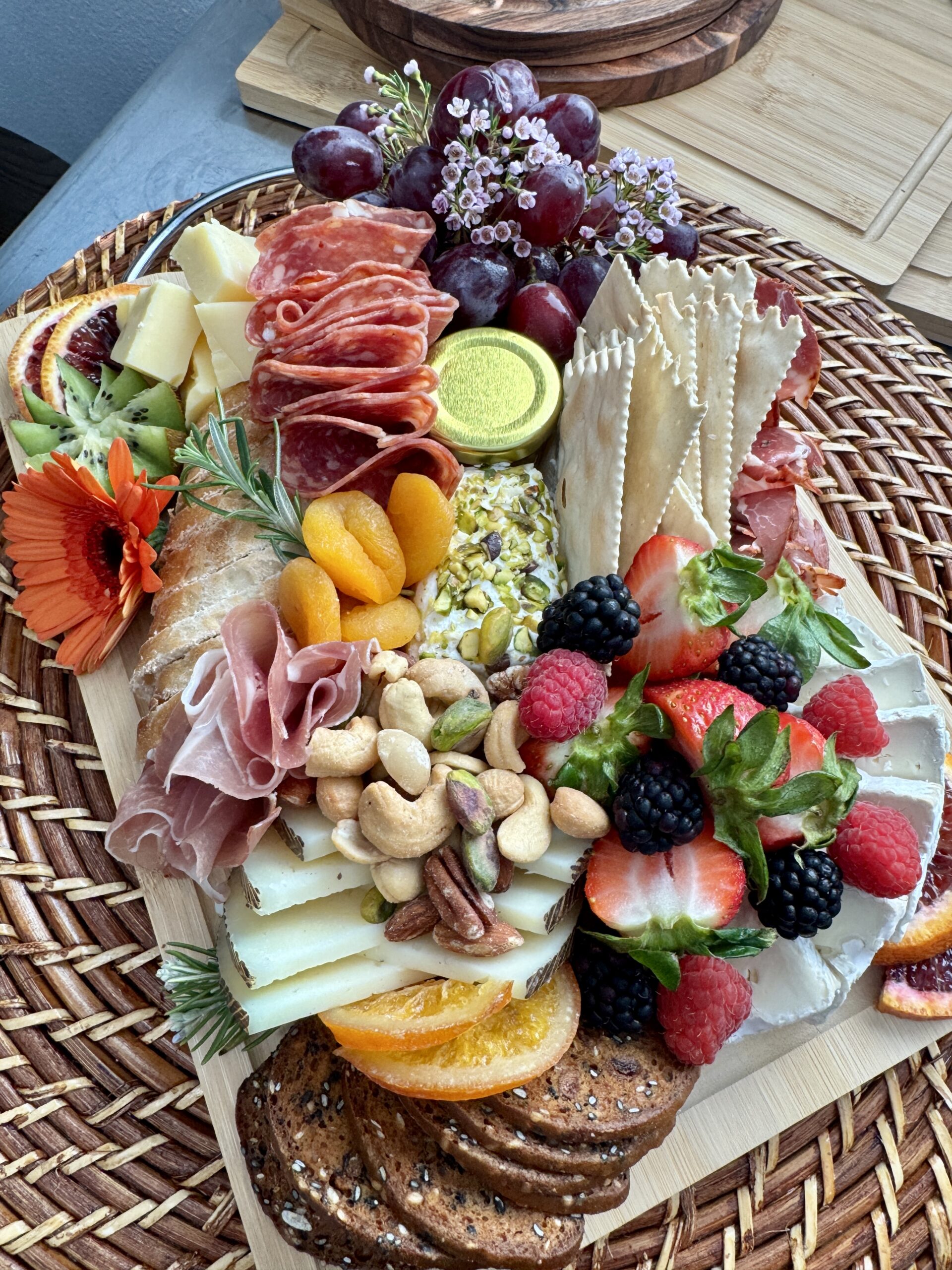 An expertly curated selection of fine cheeses and premium cured meats, thoughtfully paired with artisanal crackers, seasonal fresh fruits, dried fruits, gourmet preserves, mixed nuts, sweet biscuits, and olives. Elegantly finished with fresh floral accents for a refined presentation.